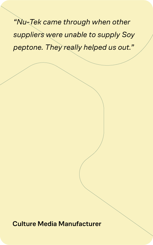 Nu-Tek believes that biotechnology can be sustainably fueled through plant- and yeast-based cell culture nutrients. Our products, used by globally recognized industry leaders, support a variety of applications from mammalian cell culture to industrial fermentation. We also supply companies leading in clinical nutrition and medicinal foods, such as allergen-free probiotics. With decades of experience and world-wide distribution, Nu-Tek BioSciences is your preferred partner for animal-free yeast extracts and plant-based peptones.