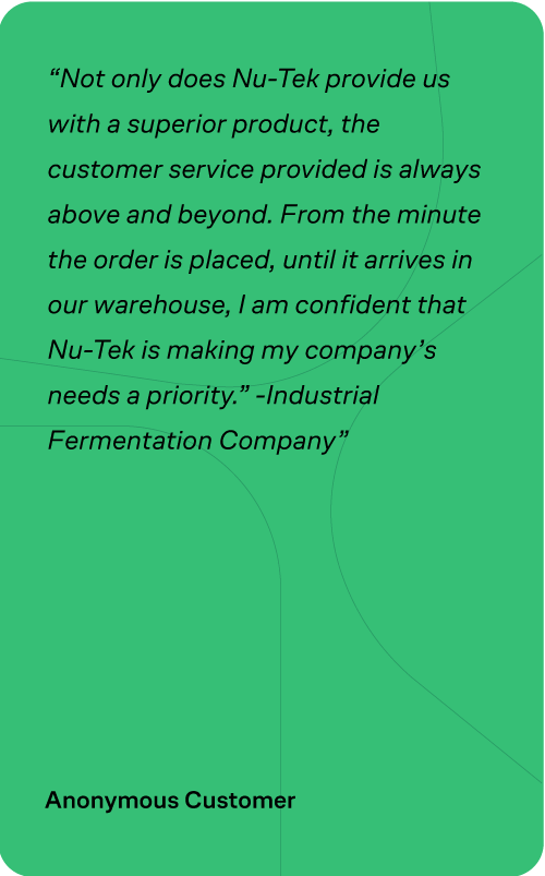 Nu-Tek knows that collaboration is the key to success. Pharmaceutical breakthroughs rely on communication, data management, and expertise to meet therapeutic goals. Nu-Tek’s team is committed to delivering premium products to support your manufacturing needs. Our dedication to customer service is expressed through our quality system, continuous improvement programs, and expert Variability Reduction Program. Contact us to learn how we can put our culture of excellence to work to support you.